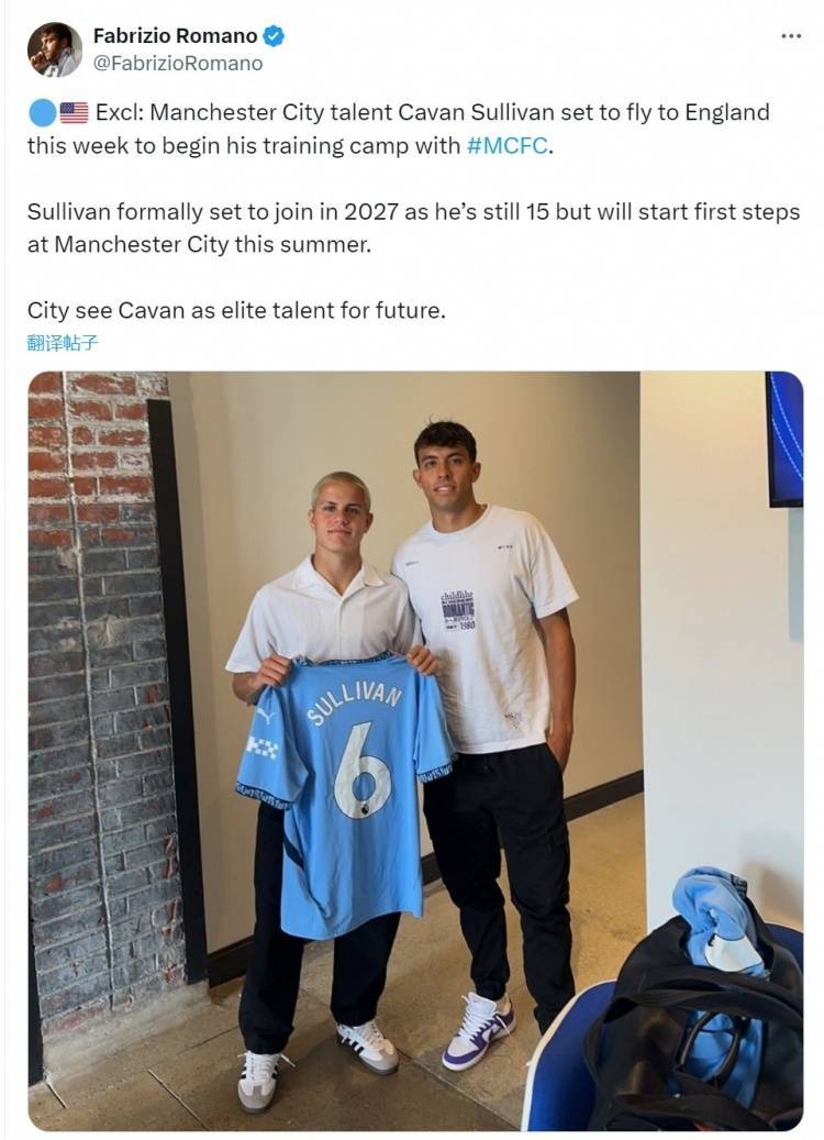 罗马诺透露,沙利文将在2027年正式加盟曼城,但他今夏将参加曼城的训练,这位美国中场将于本周前往英格兰,与曼城会合,俱乐部将其视为未来的顶尖人才。