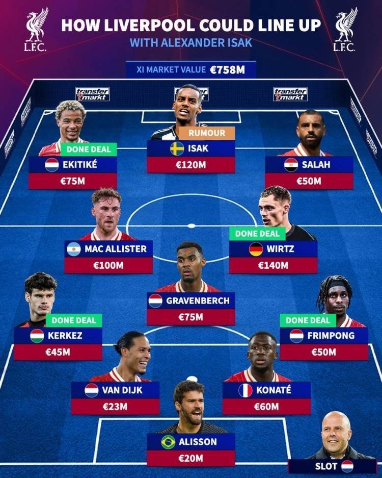 直播吧7月24日讯 利物浦刚刚官宣埃基蒂克,而多方消息确认,伊萨克已经告知纽卡希望离队,《转会市场》也据此预测了红军新赛季主力阵容。